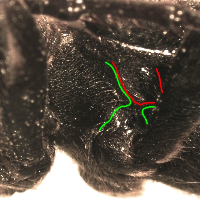 Questa e la stessa di prima, dove ho segnato col verde i limiti degli sterni e col rosso quelli del mesepimero. Secondo me le coxe sono aperte... ma non te la do al 100% ... |