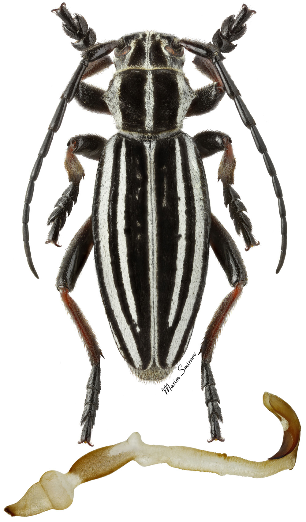 Dorcadion (Acutodorcadion) taldykurganum Danilevsky, 1996 (or D. suvorovi taldykurganum if someone likes that more. It is derived from suvorovi evidently and with such a wide variety of local forms of the latter, I see no reason to give it species status personally) It is blackish (dull-colored maybe) and very variable beetle in terms of elytral pattern. Size ~ 15-17 mm for males. S Kazakhstan, Taldykorgan env., 45°2'7,7"N 78°31'3"E h = 734 m. 20.IV.2025 leg. M. Smirnov